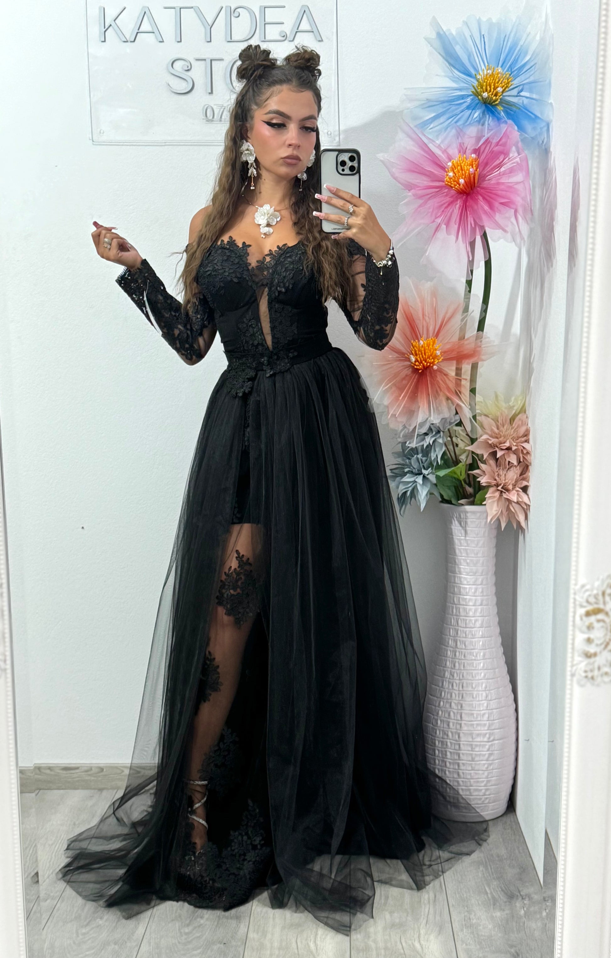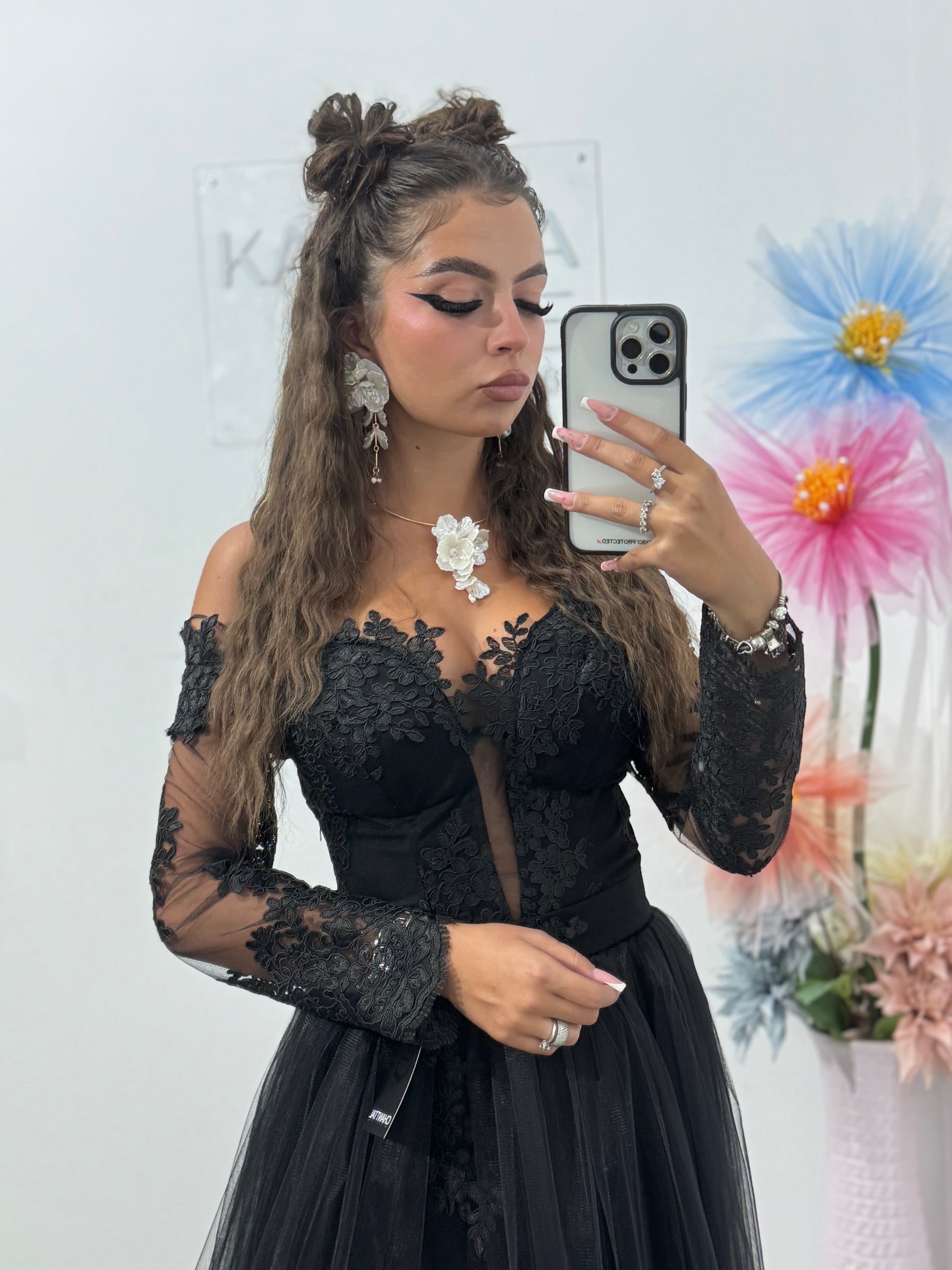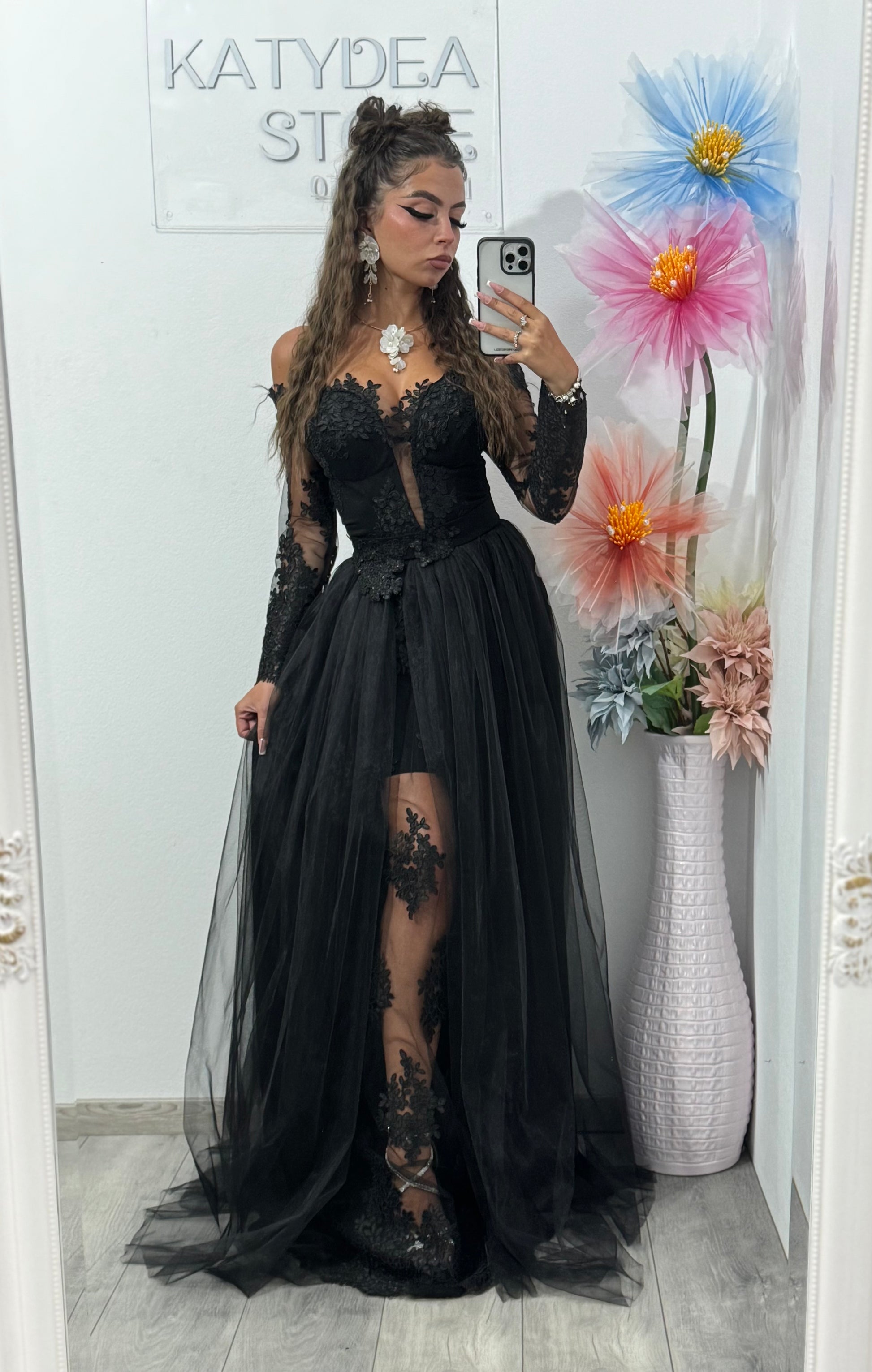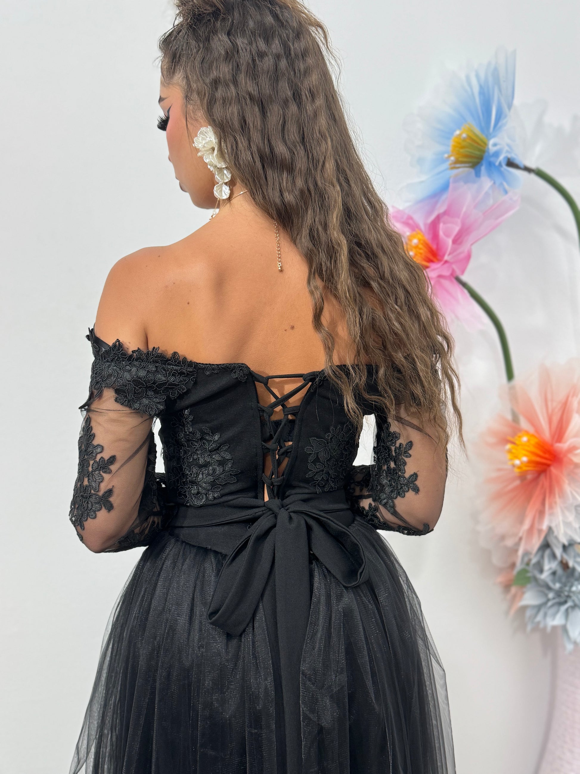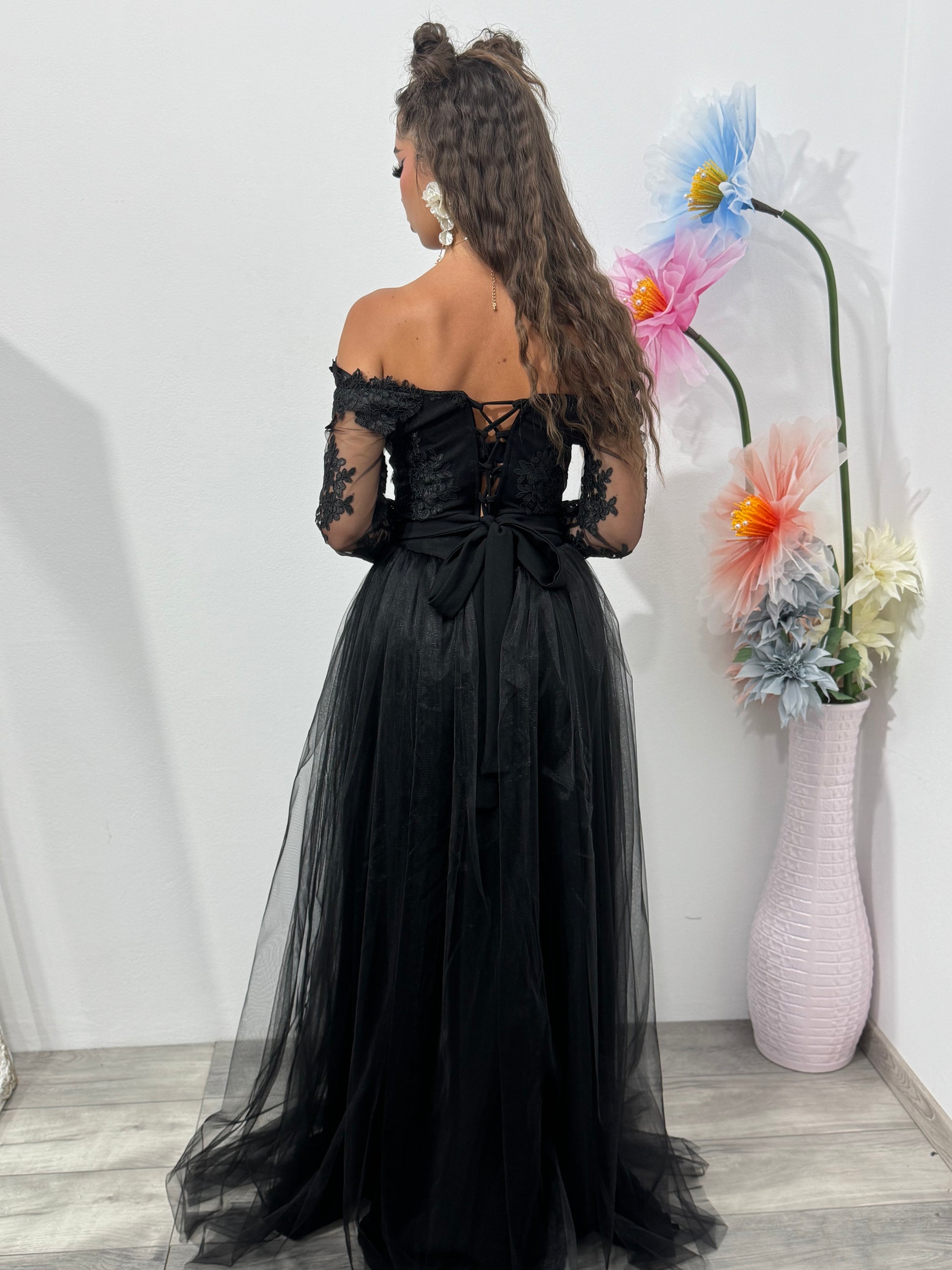 Rochie de seară neagră cu dantelă și tull – eleganță absolută