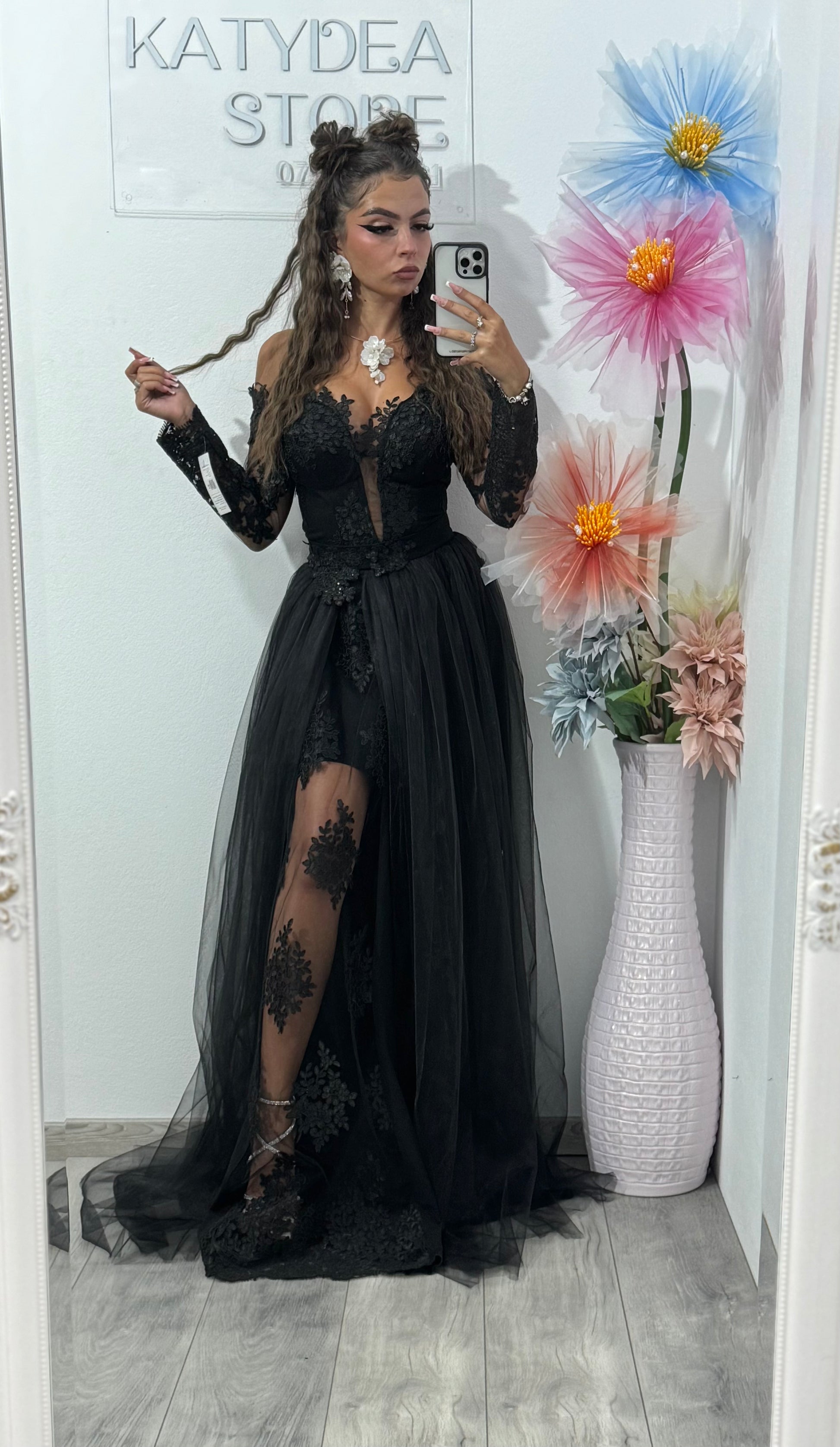 Această rochie neagră îmbină perfect rafinamentul clasic cu accente moderne, fiind alegerea ideală pentru femeia care dorește o apariție spectaculoasă și plină de stil.