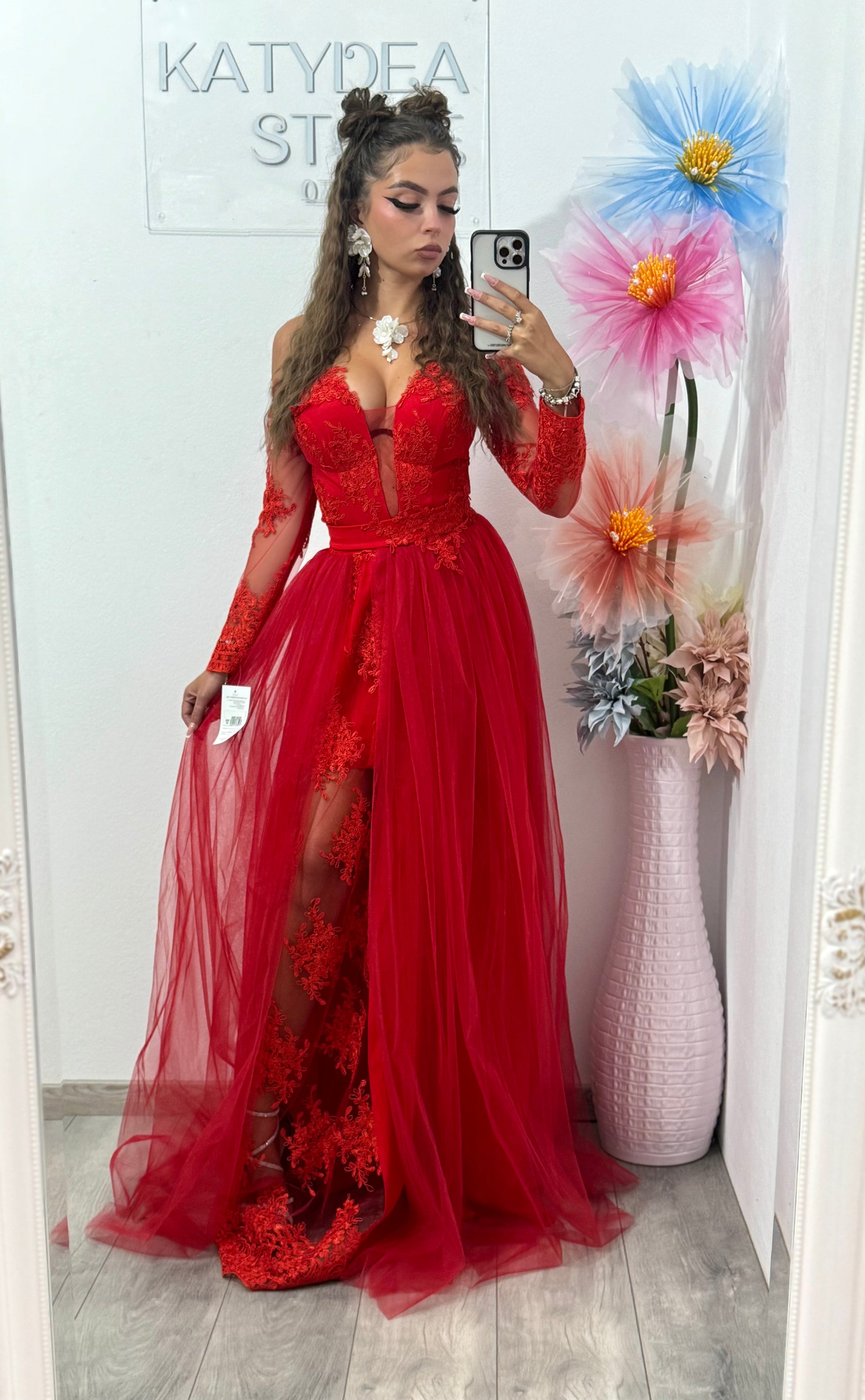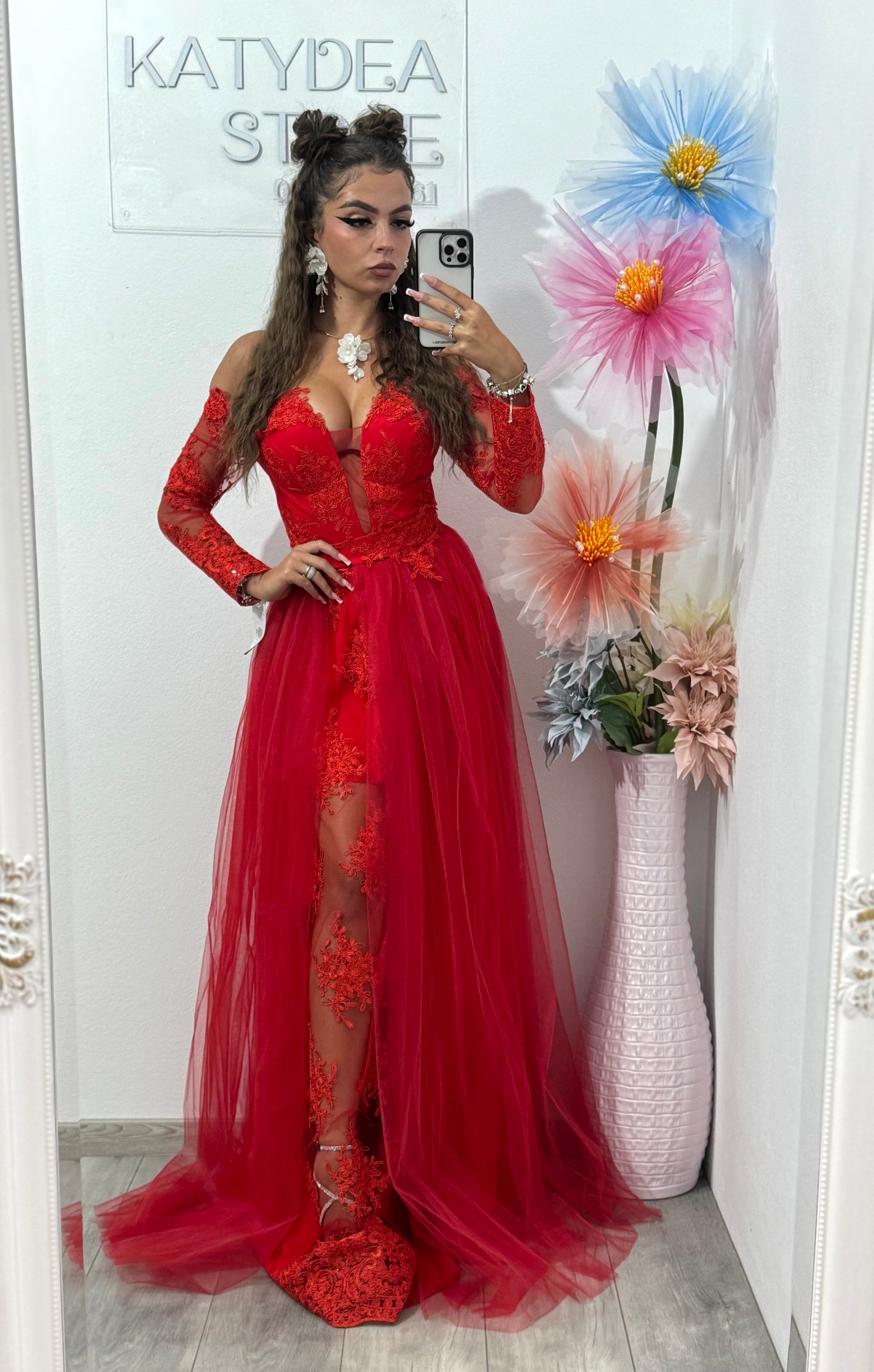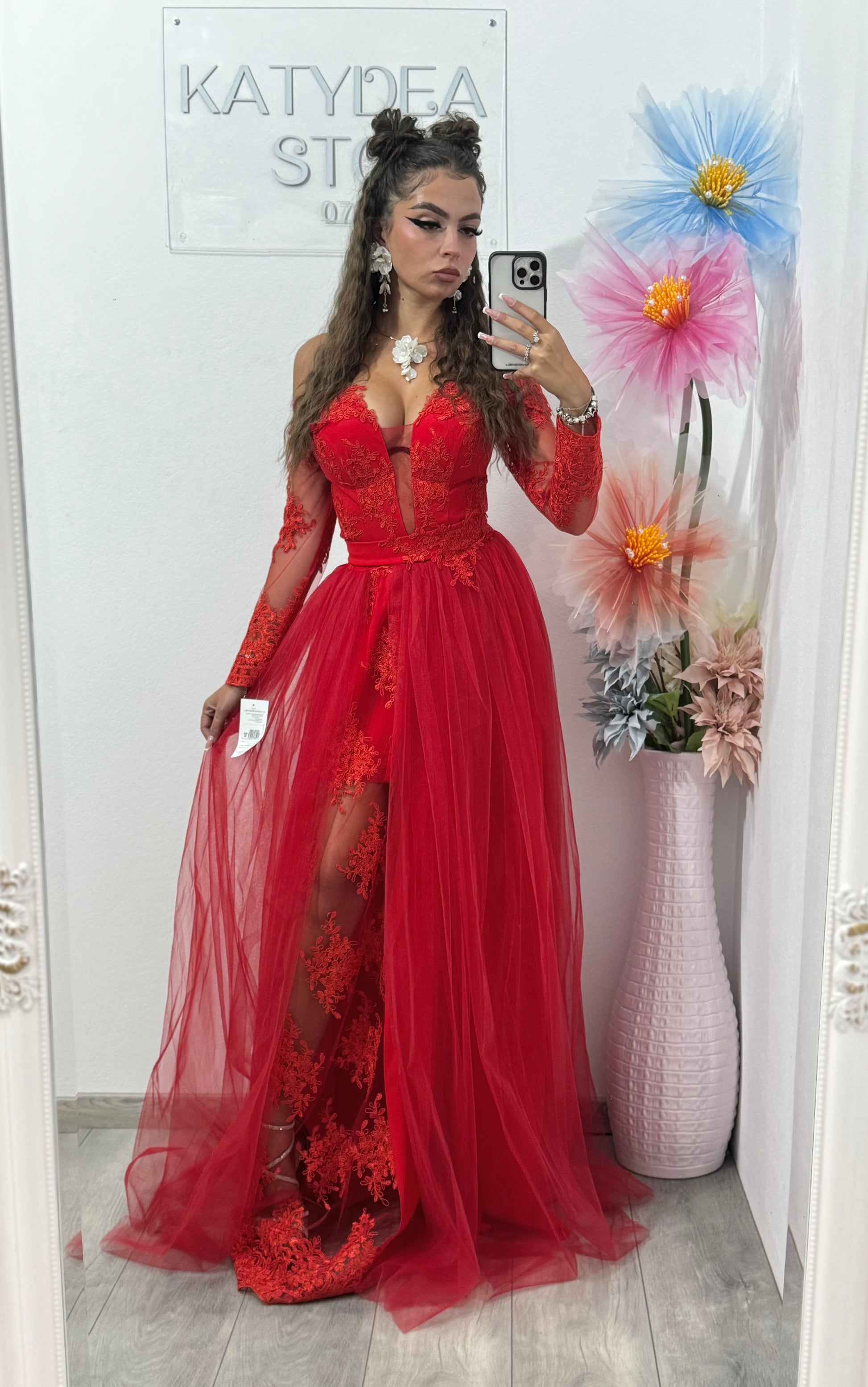 Rochie de seară roșie din dantelă și tull cu detalii spectaculoase