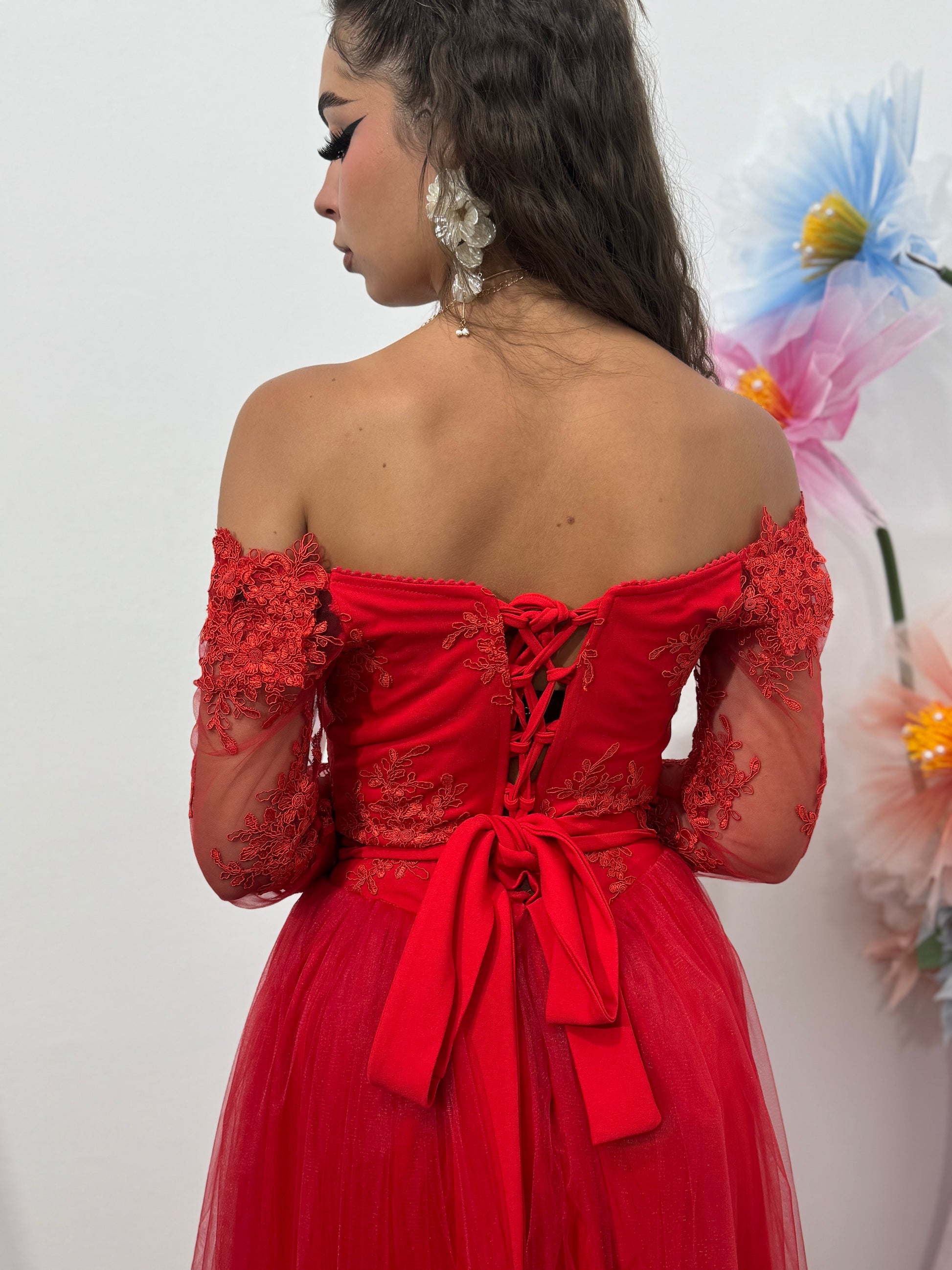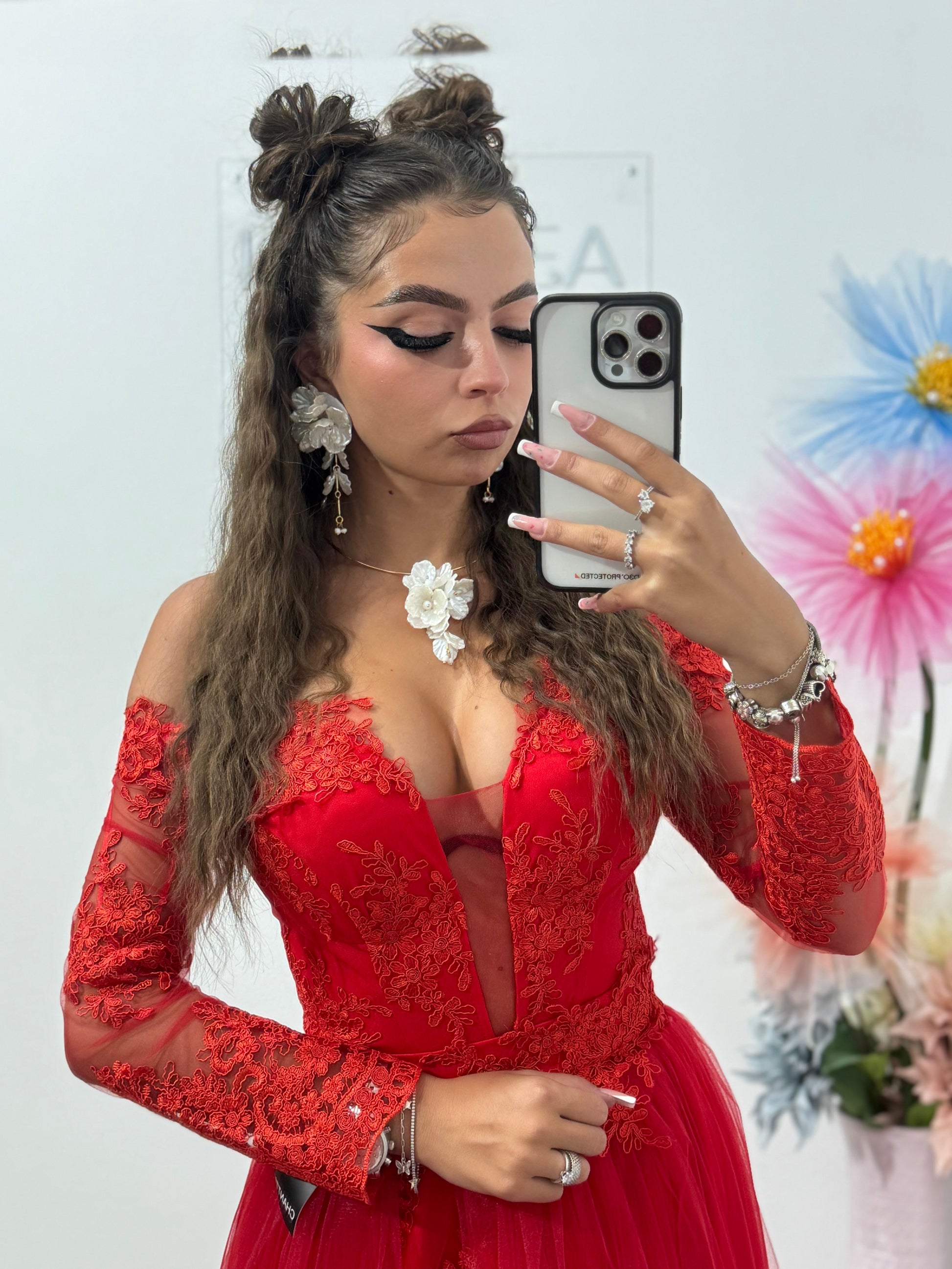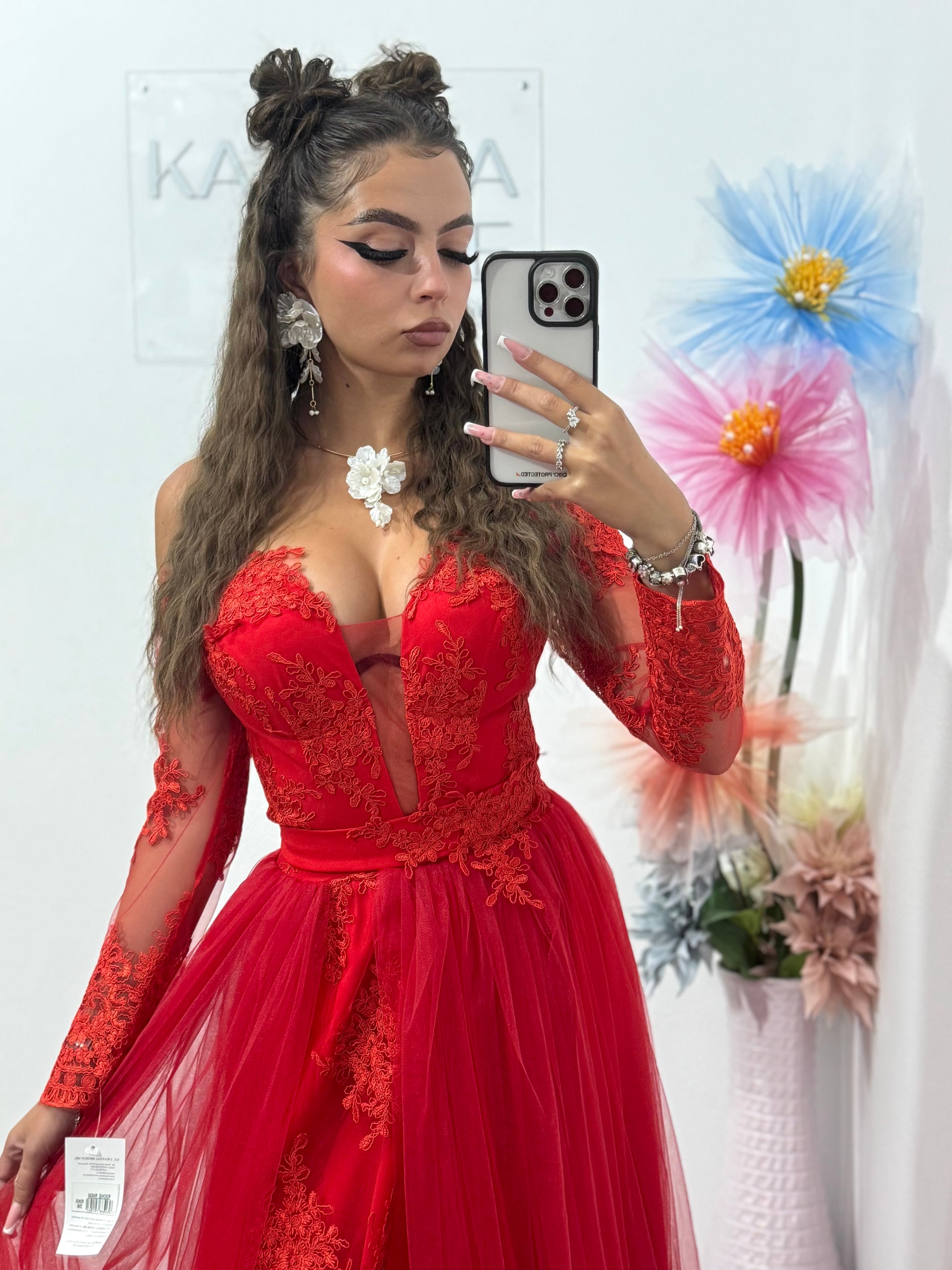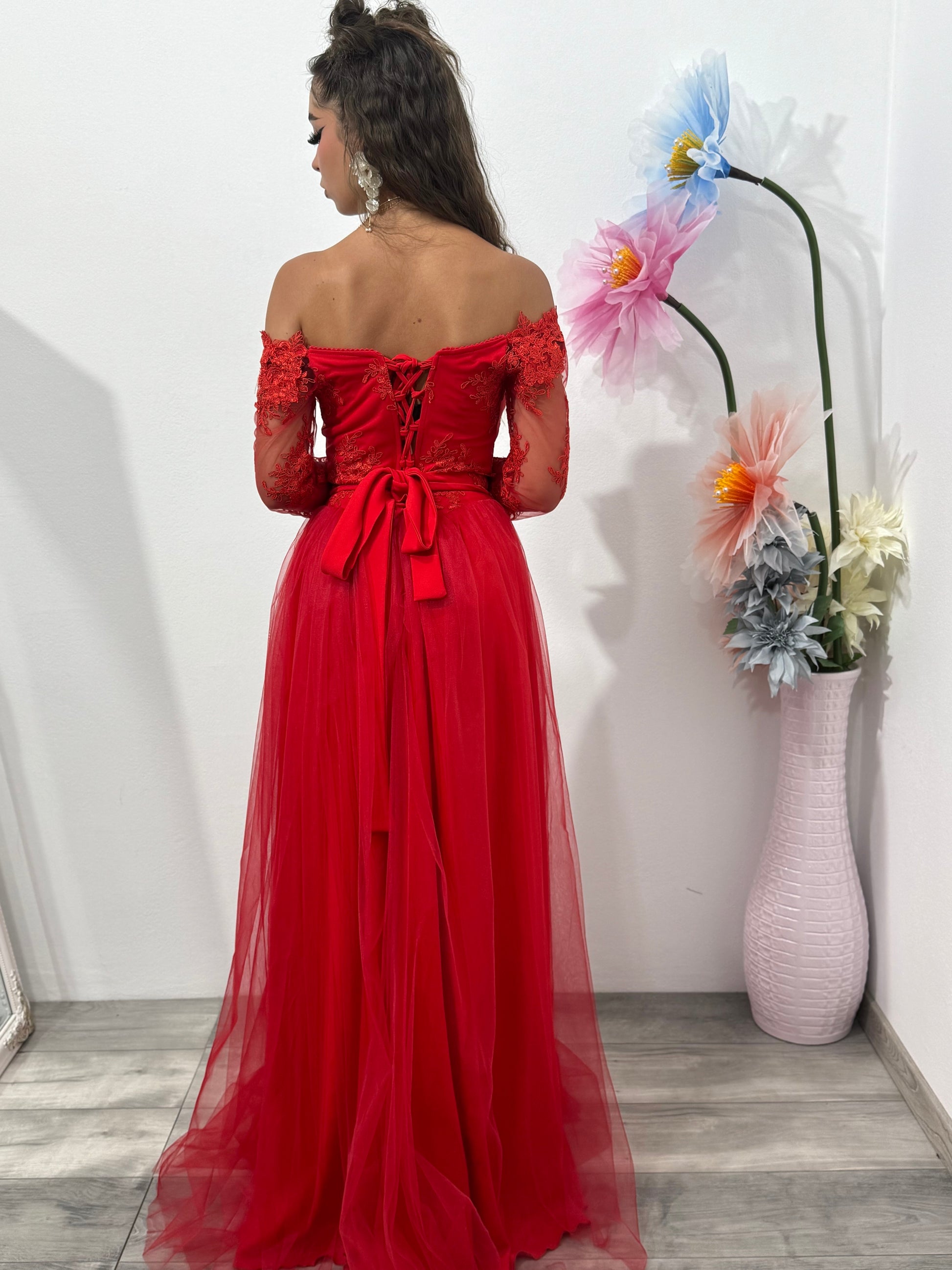 Rochie de seară roșie din dantelă și tull cu detalii spectaculoase