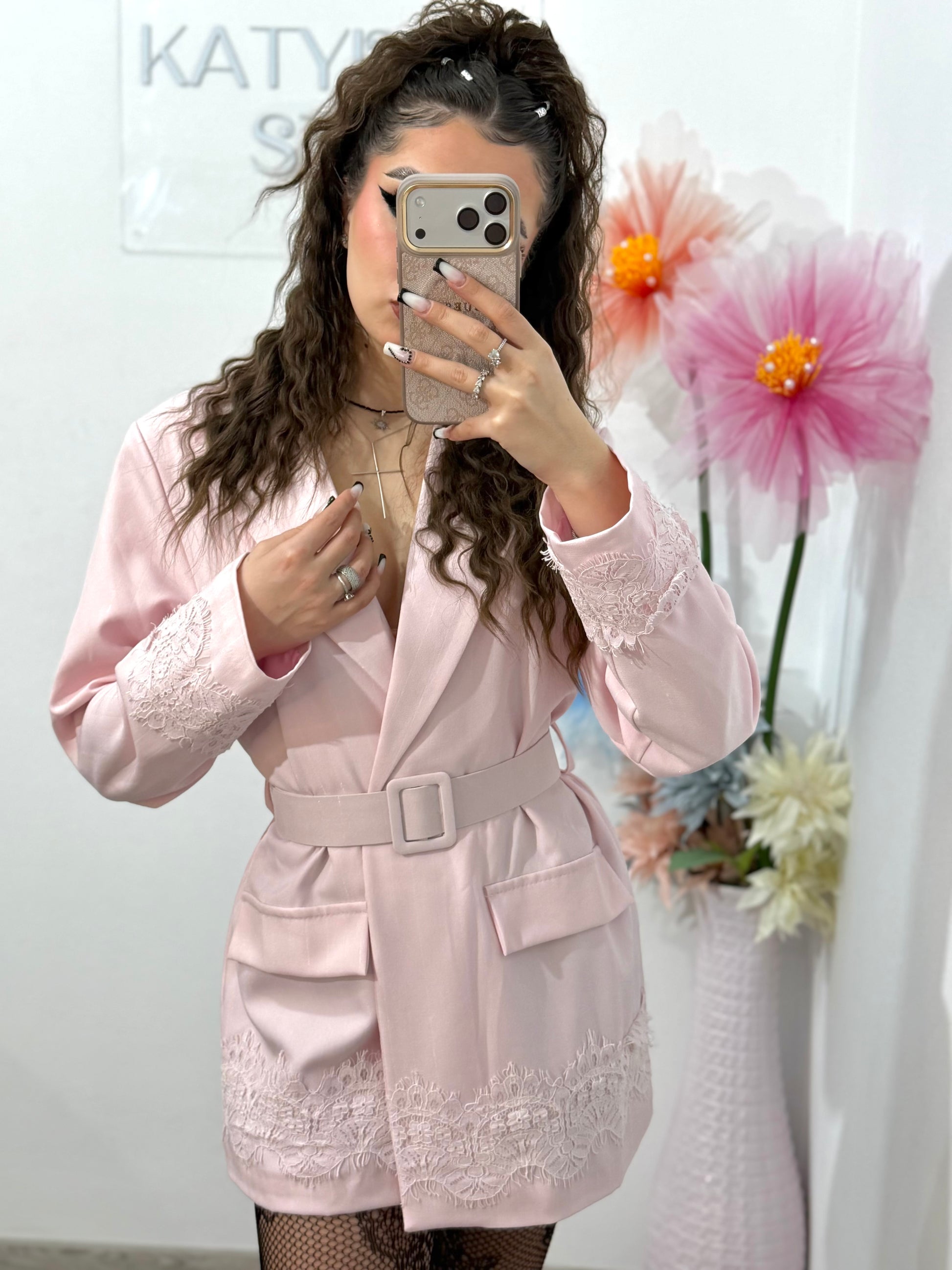 Sacou cu dantelă și curea roz ANDREEA