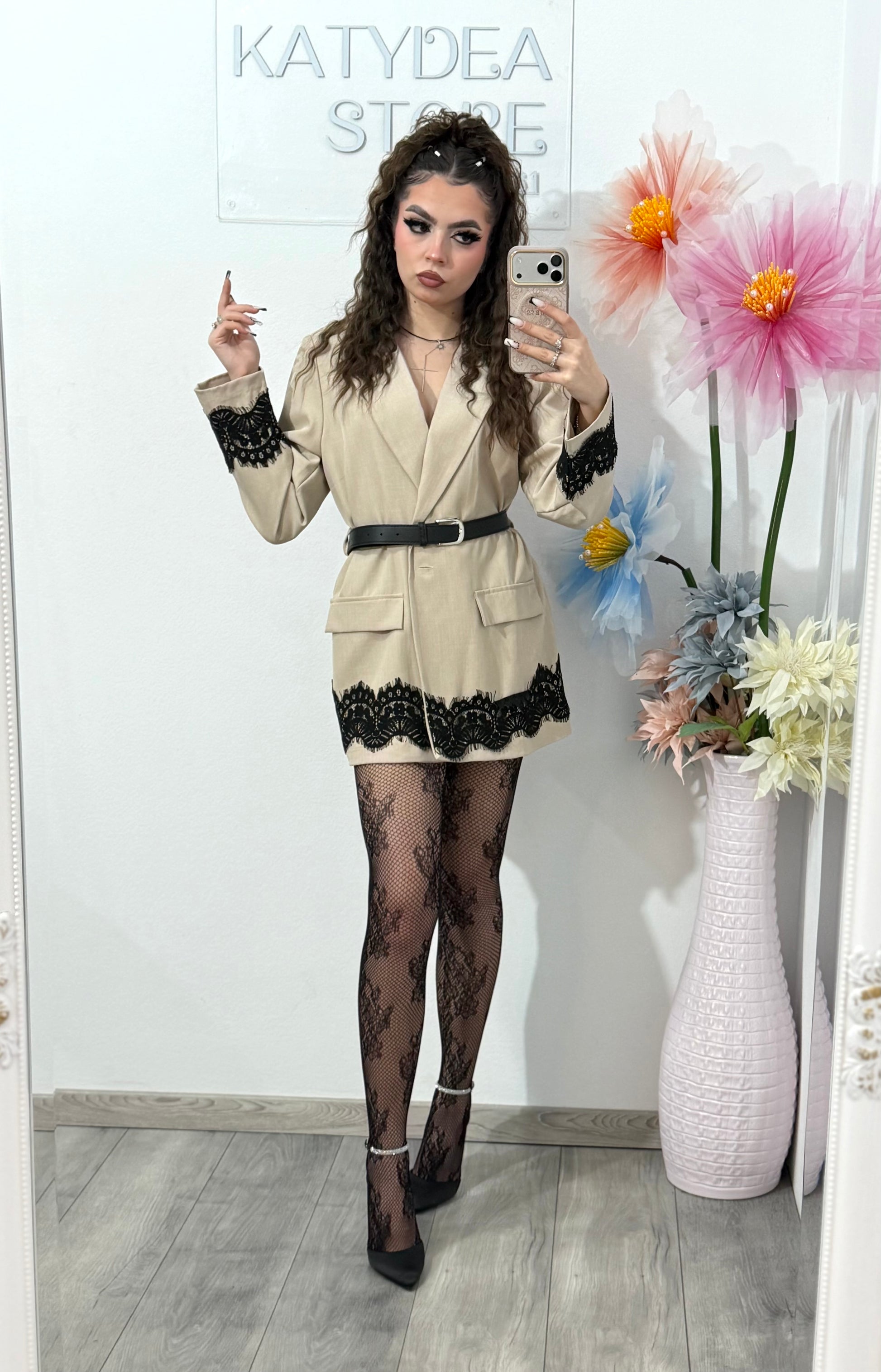 Sacou elegant ,perfect pentru un look feminin și sofisticat. Model cambrat, evidențiat în talie cu o curea subțire, pentru o siluetă bine definită. Designul este completat de inserții din dantelă neagră la manșete și la baza sacoului, oferind un contrast rafinat și un plus de stil.