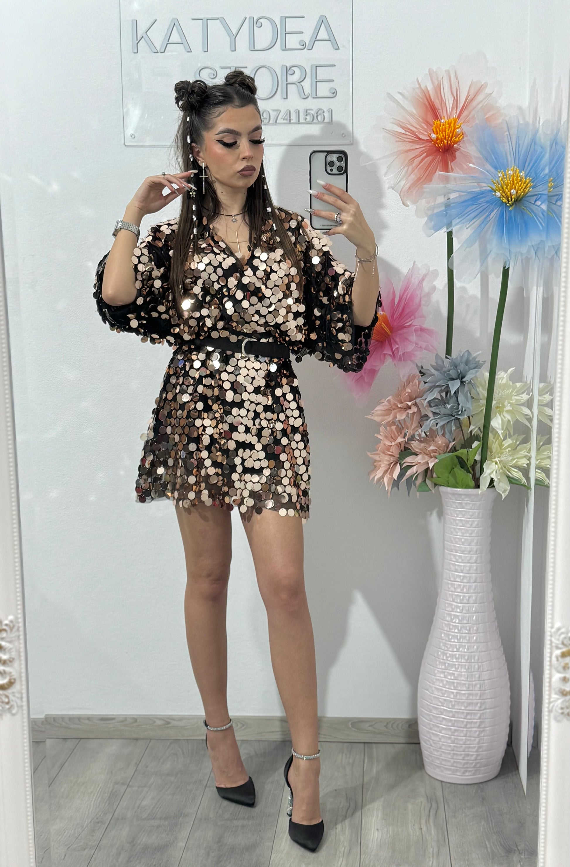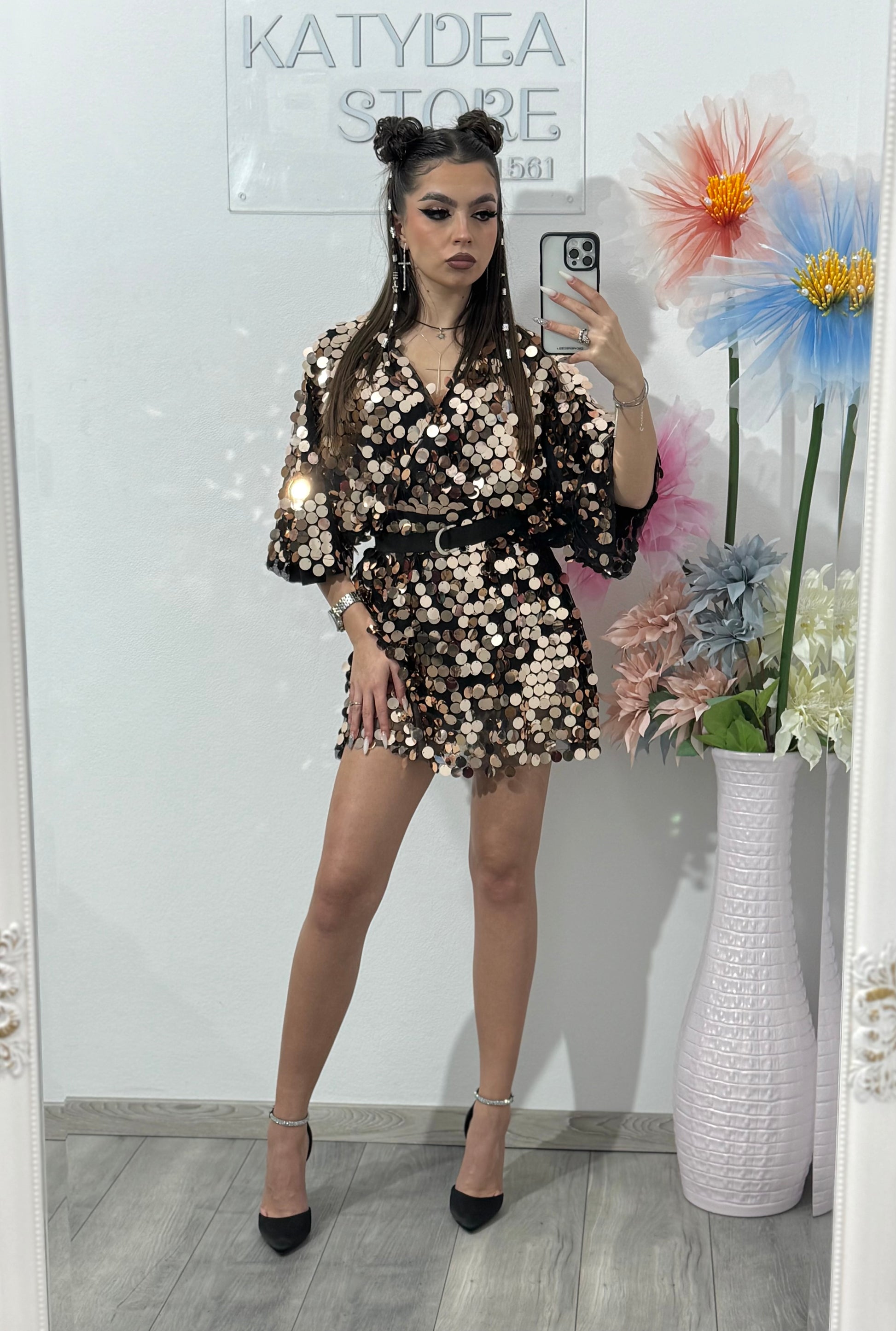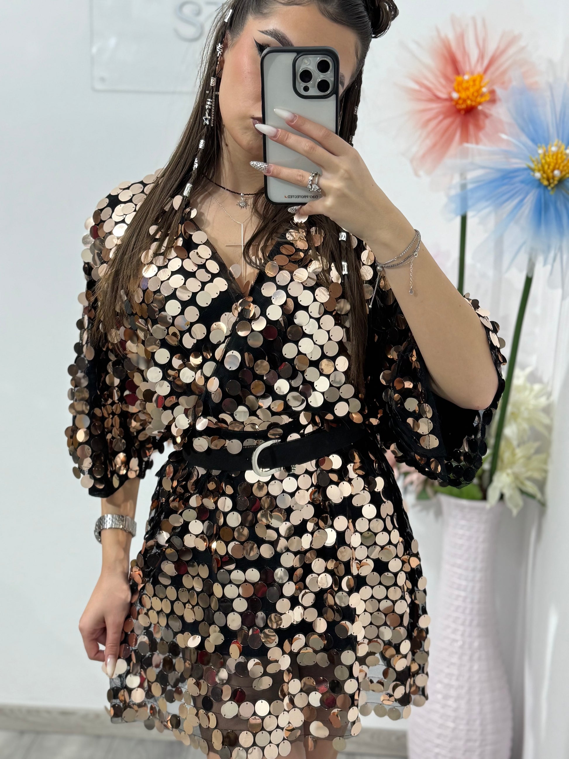 Talie este bine definită cu ajutorul unui cordon subțire negru, iar croiala scurtă oferă un look modern și feminin. Materialul captează lumina la fiecare mișcare, fiind ideal pentru petreceri, evenimente speciale, club sau ocazii festive.