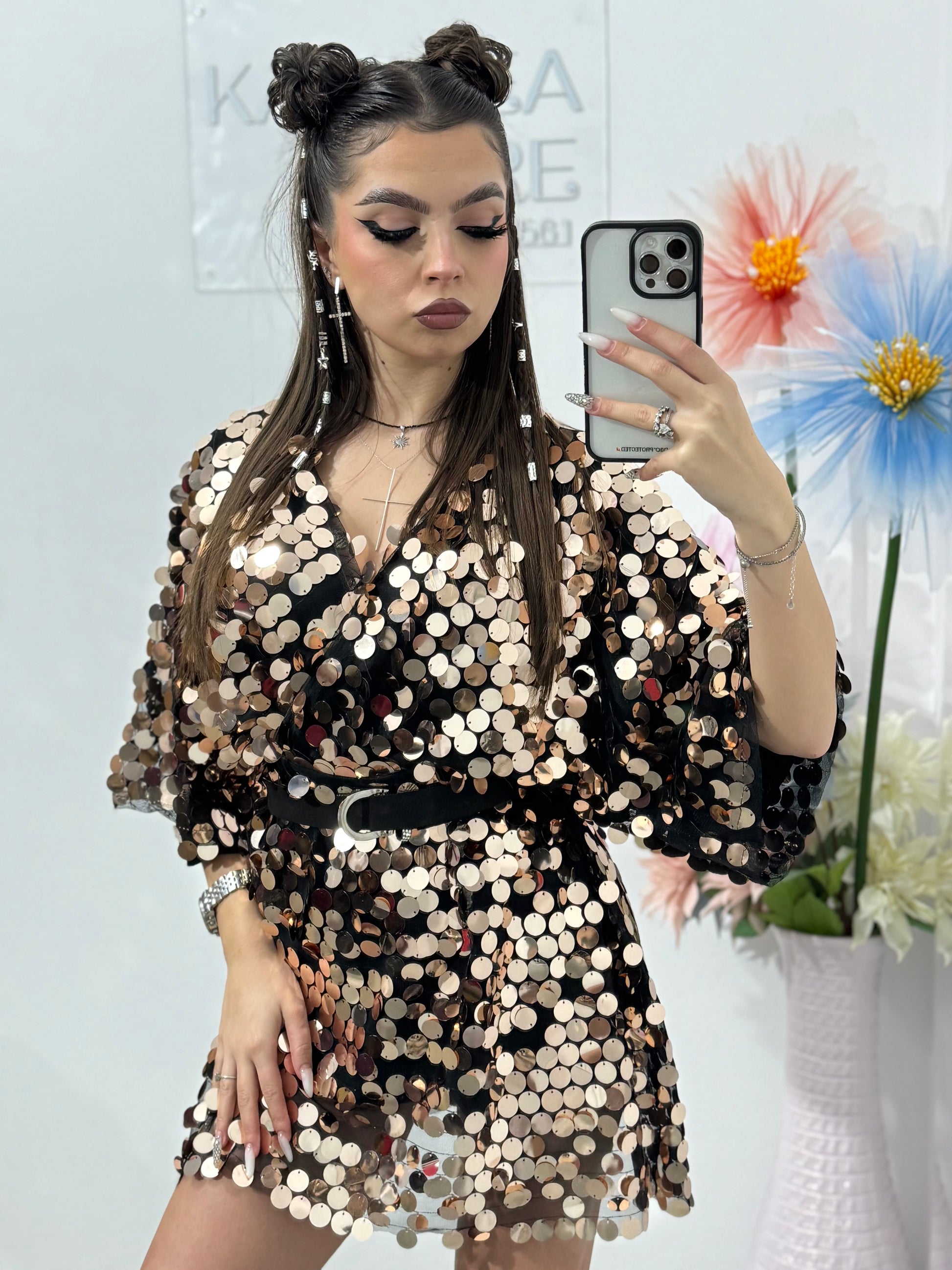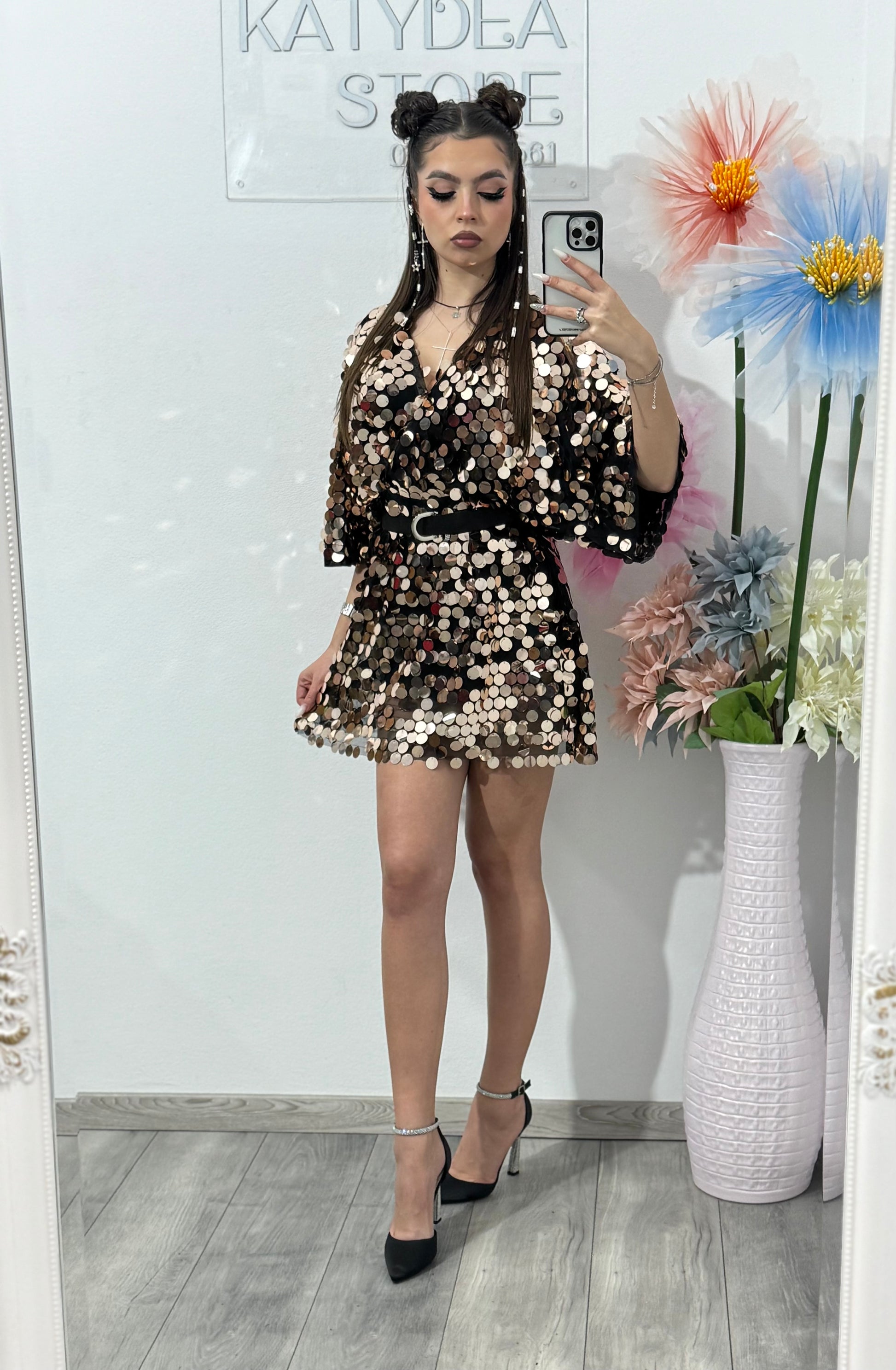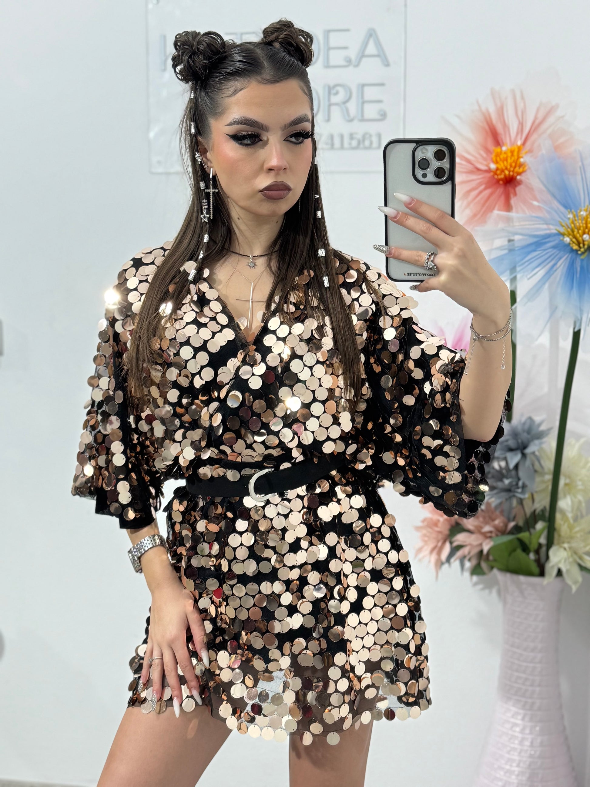 Talie este bine definită cu ajutorul unui cordon subțire negru, iar croiala scurtă oferă un look modern și feminin. Materialul captează lumina la fiecare mișcare, fiind ideal pentru petreceri, evenimente speciale, club sau ocazii festive.