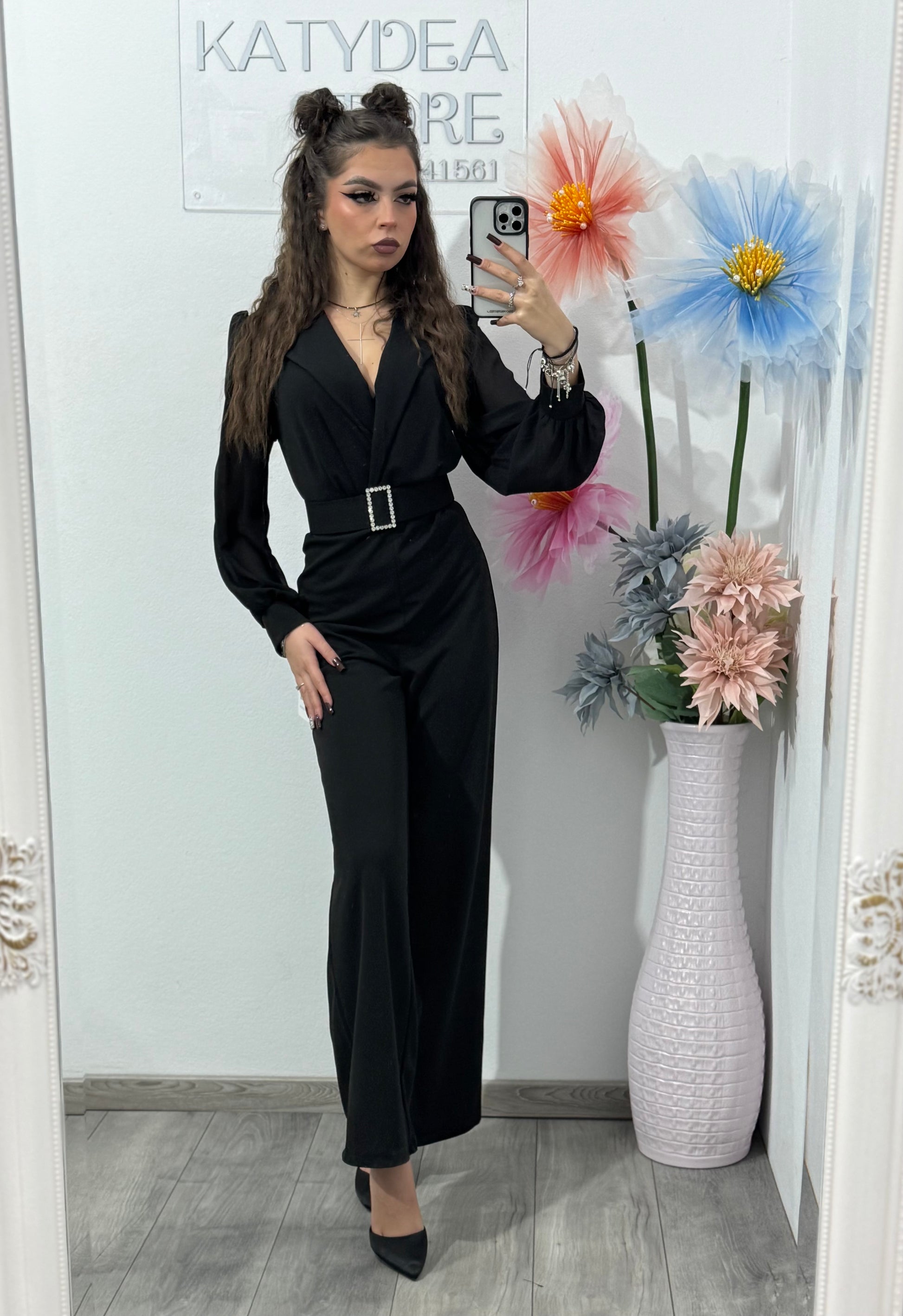 Această salopetă elegantă neagră este alegerea perfectă pentru un look sofisticat și rafinat, potrivit atât pentru evenimente de seară, cât și pentru întâlniri speciale. Croiul său modern subliniază frumos talia, oferind o siluetă alungită și elegantă.
