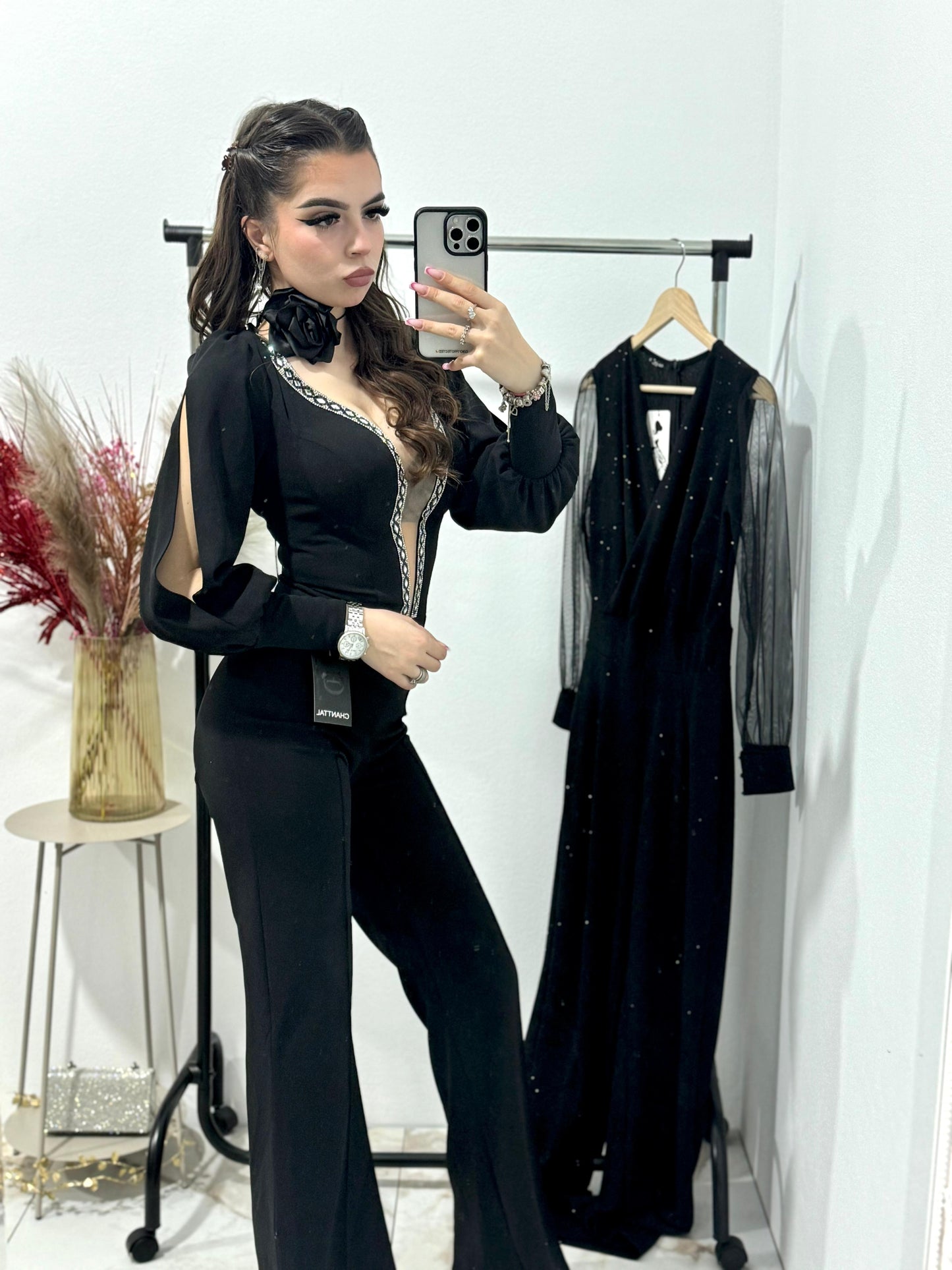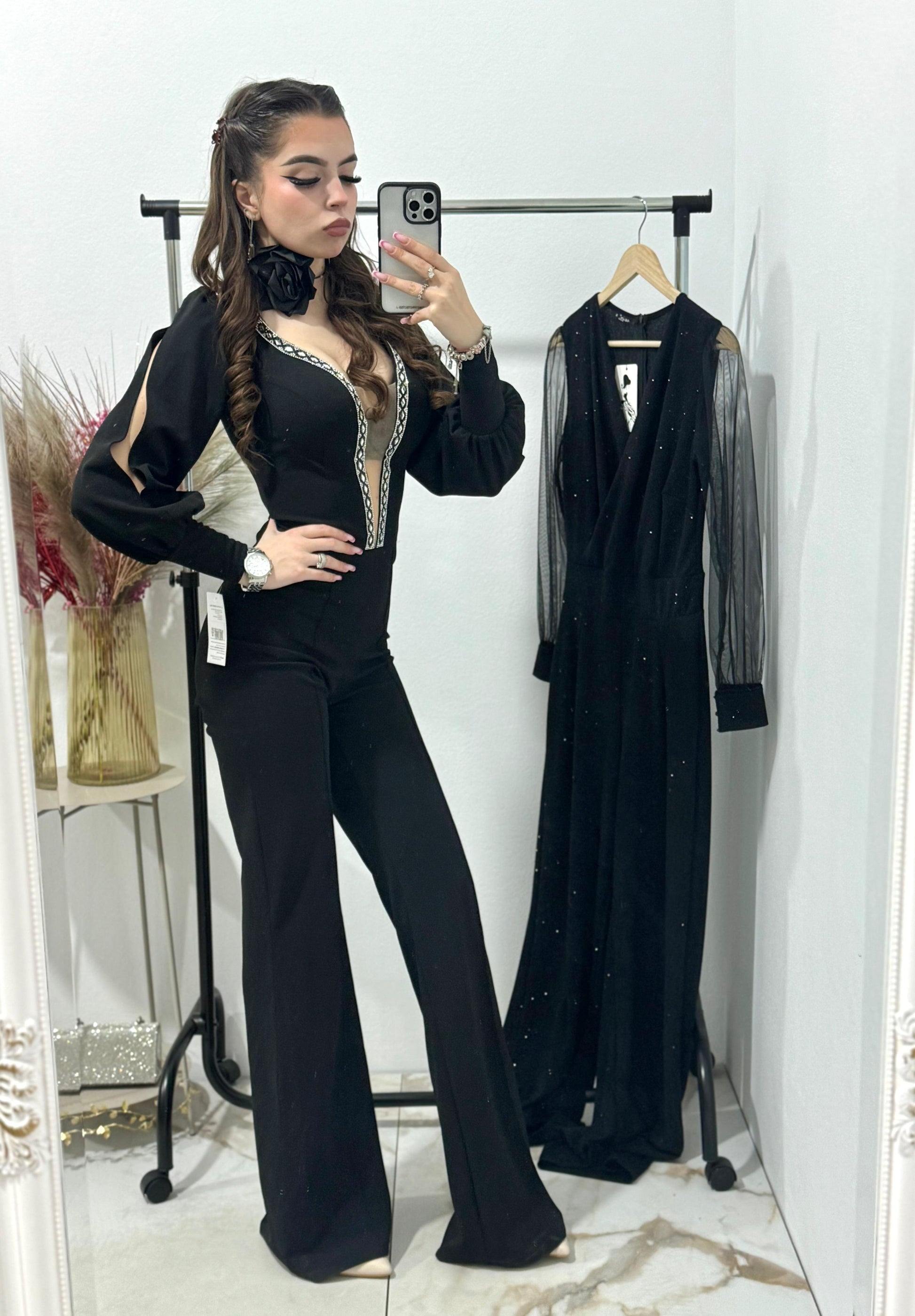 Salopeta neagra ,eleganta cu pantalon evazat și mâneca crapata.