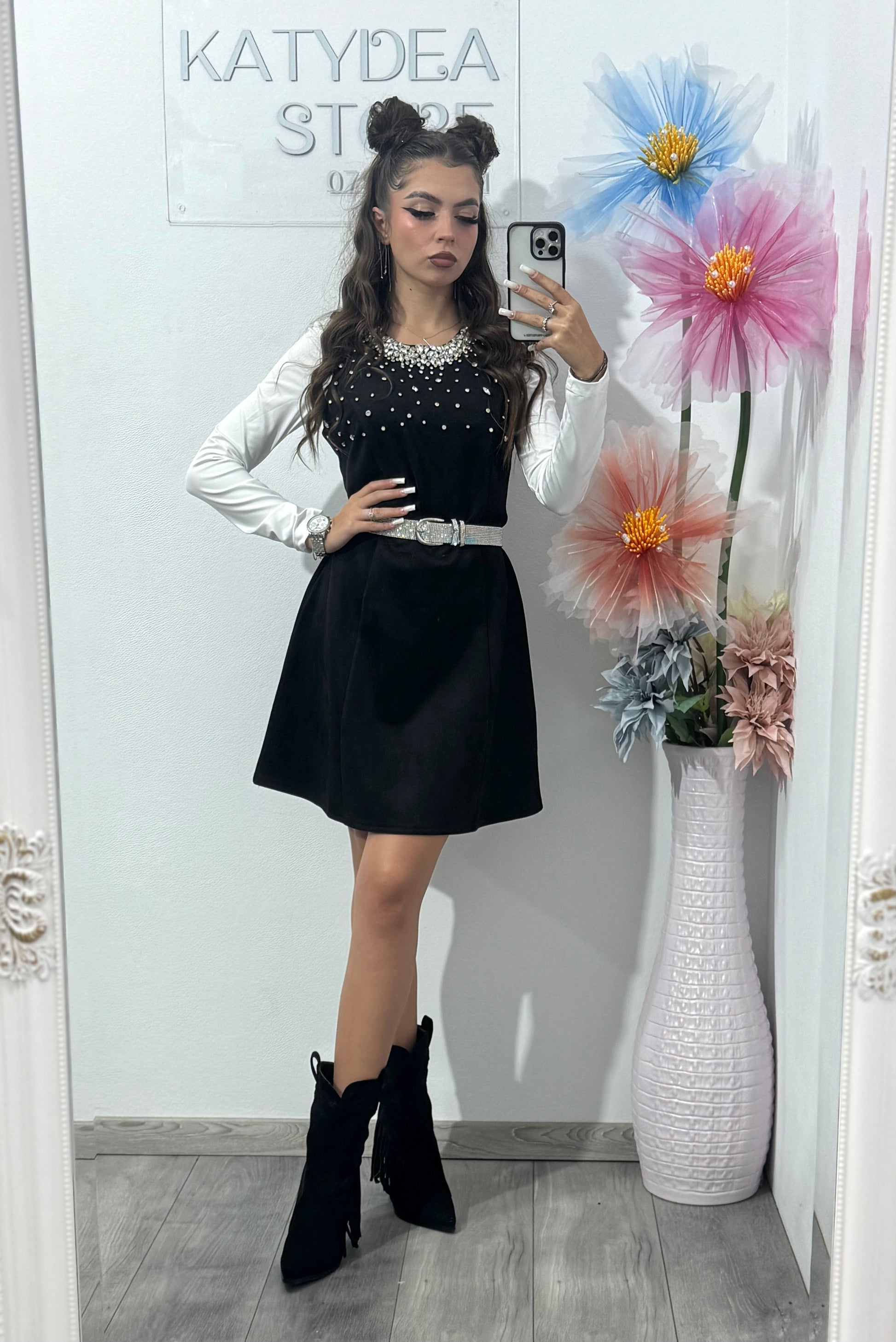 Sarafan negru, croi în „A”, cu detalii sofisticate la guler – perle aplicate pentru un plus de rafinament. Model versatil, ușor de purtat peste o cămașă, maletă sau bluză, perfect atât pentru ținute office, cât și pentru evenimente speciale.