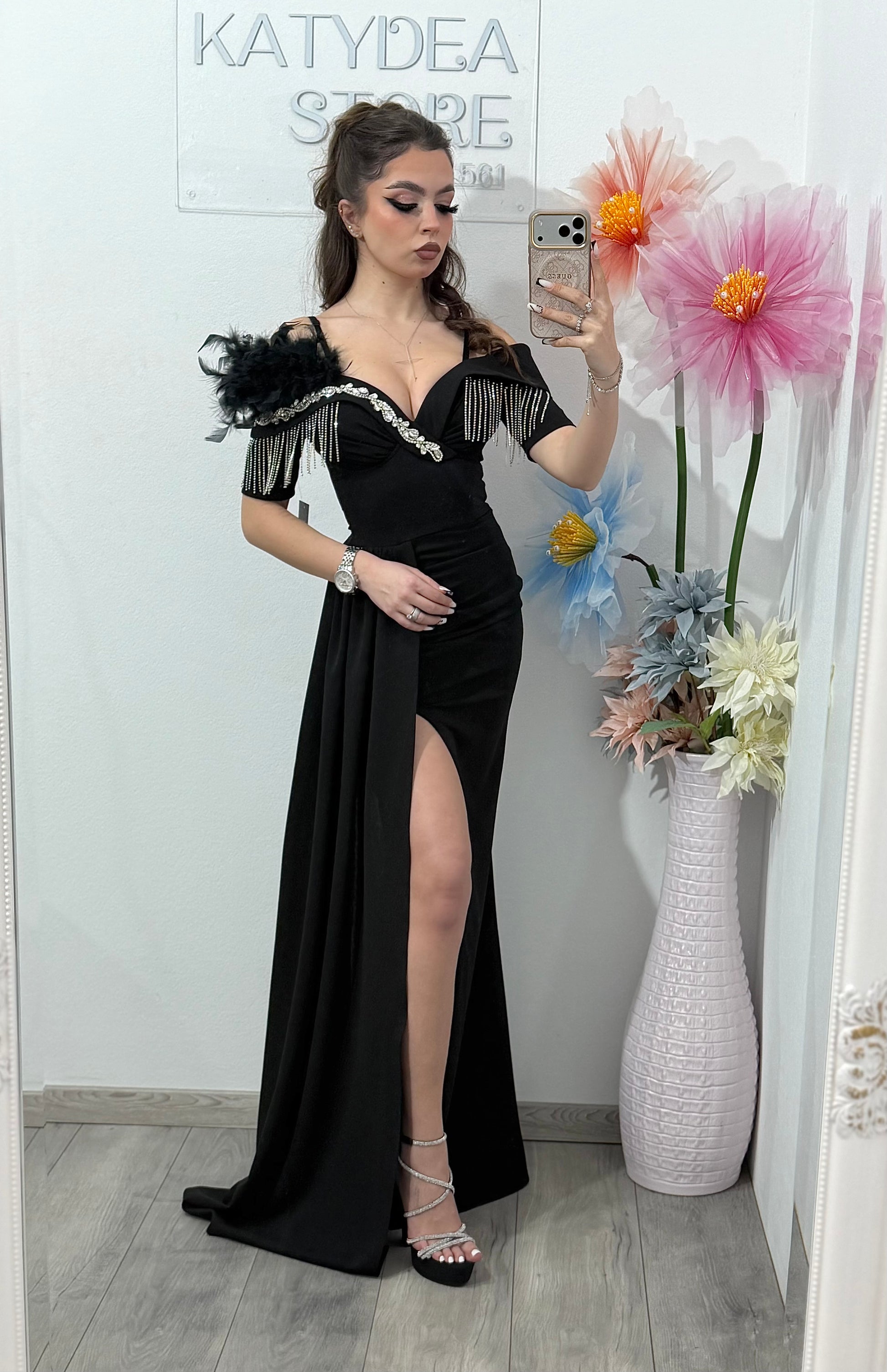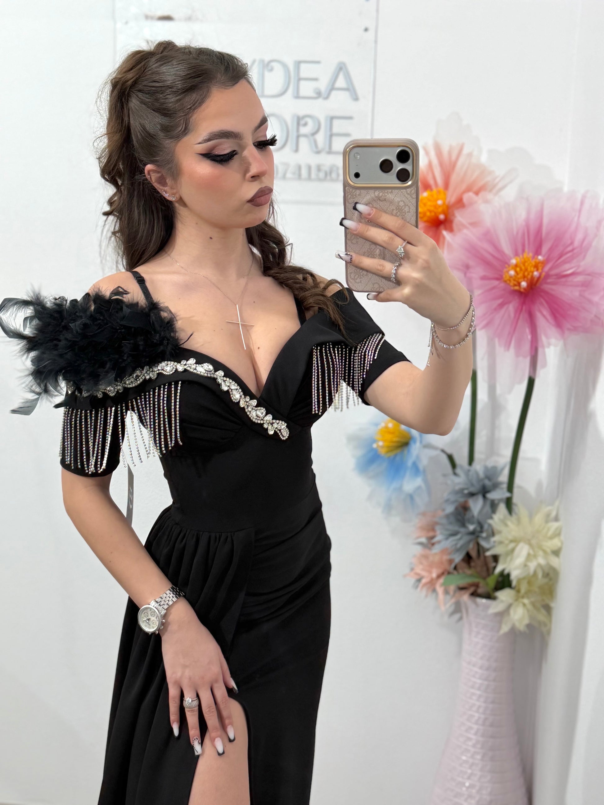 Rochie elegantă off-shoulder cu slit și detalii luxury